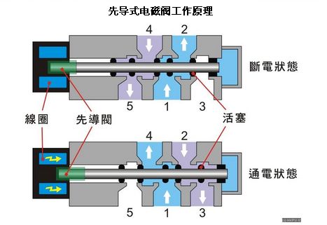 电磁阀的工作原理,电磁阀里有密闭的腔,在不同位置开有通孔,每个孔都通向不同的油管,腔中间是阀,两面是两块电磁铁,哪面的磁铁线圈通电阀体就会被吸引到哪边,通过控制阀体的移动来挡住或漏出不同的排油的孔而进油孔是常开的,液压油就会进入不同的排油管,然后通过油的压力来推动油缸的活塞,活塞又带动活塞管,活塞管带动机械装置动。这样通过控制电磁铁的电流就控制了机械运动。